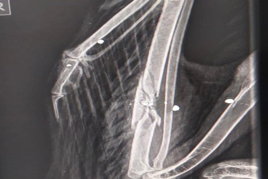 El ave presenta fractura de ulna o cúbito del ala derecha y tiene algunos perdigones incrustados en el tejido muscular.