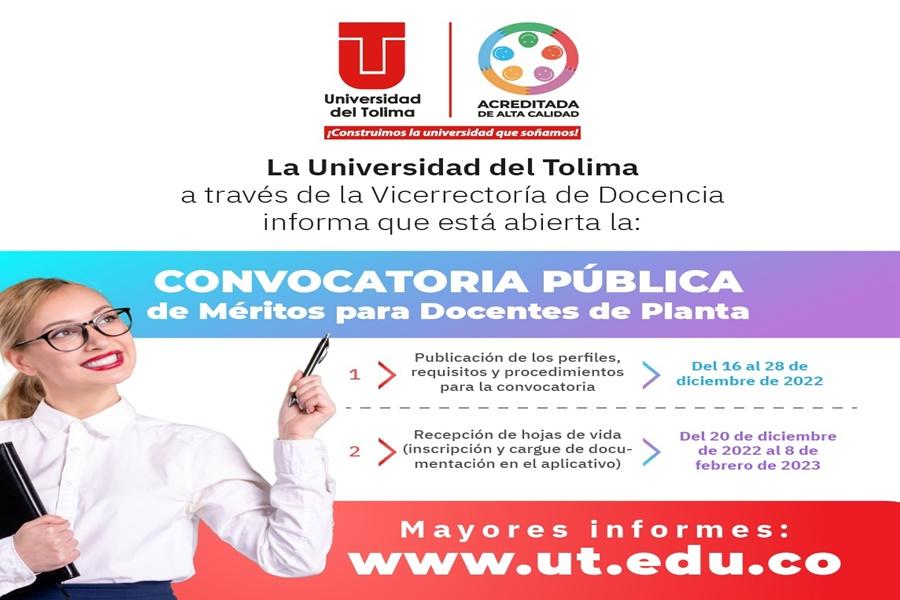 La Universidad del Tolima convoca al concurso público de méritos a realizarse en el año 2023, para la provisión de treinta y seis (36) cargos de profesores de planta de tiempo completo y medio tiempo. Mediante acuerdo del Consejo Académico Nº 184 del 7 de diciembre del 2022 se reglamenta los términos de referencia de la convocatoria de la Universidad del Tolima.