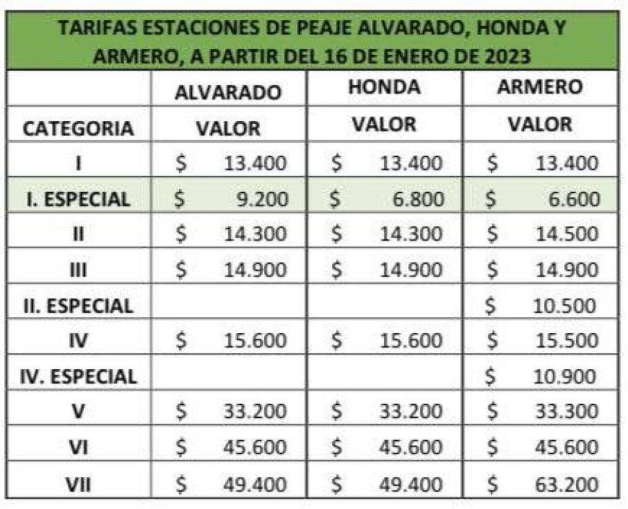 El comunicado de la empresa apunta a lo siguiente; "Teniendo en cuenta que no se ha recibido por parte del Ministerio de Transporte el Decreto que establece el no incremento de las tarifas en los peajes para el año 2023, la Concesionaria Alternativas Viales S.A.S. a cargo del corredor vial Ibagué — Honda, Cambao — Manizales, se permite informar a la comunidad en general que, como parte de su obligación contractual, a partir de hoy 16 de enero a las 06:00 horas se implementarán las nuevas tarifas en los peajes de Alvarado, Honda", señala el documento.