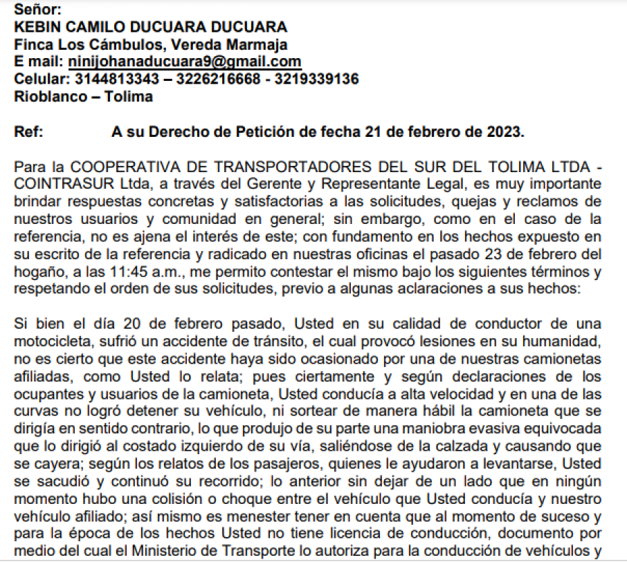 Ducuara envió un derecho de petición, el cual fue respondido por parte del abogado que representa la empresa transportadora, allí le indicaron que a él no le había pasado nada y que era mentira la acusación que hacía Kevin Camilo.