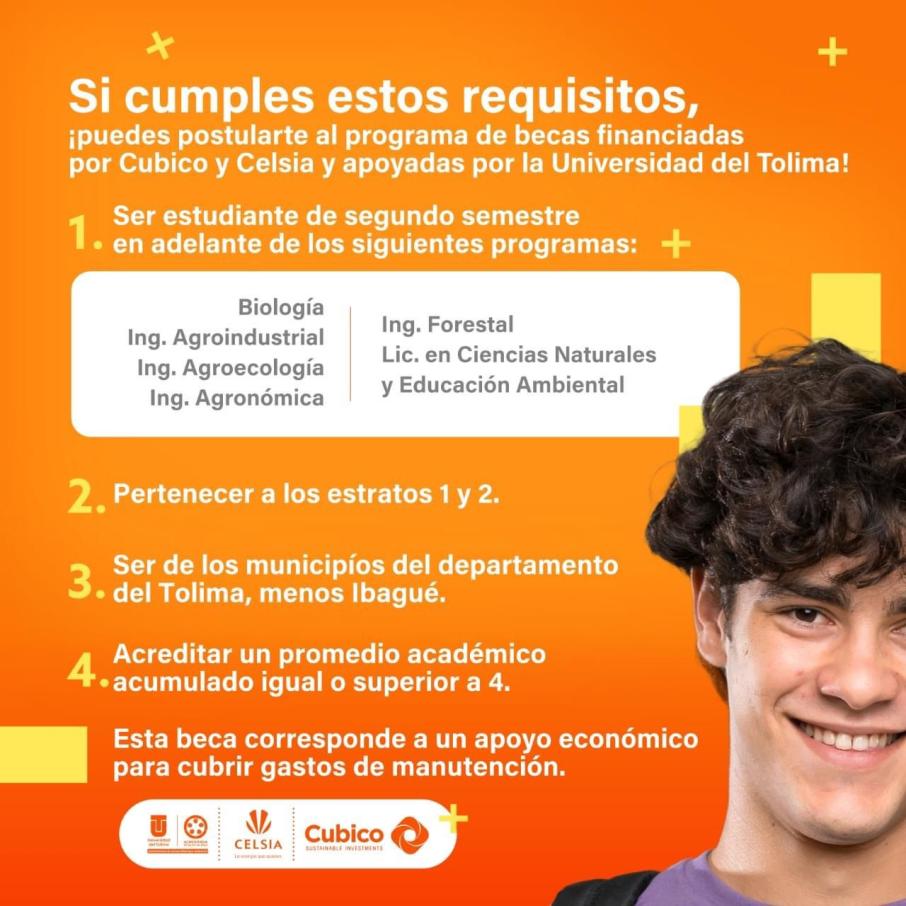 Celsia, empresa de energía del Grupo Argos, Cubico Sustainable Investments (aliado de Celsia para la realización de proyectos de energía renovable), y la Universidad del Tolima lanzan la segunda convocatoria de 25 becas de manutención (alimentación y hospedaje) para estudiantes de pregrado de la institución educativa en las carreras: