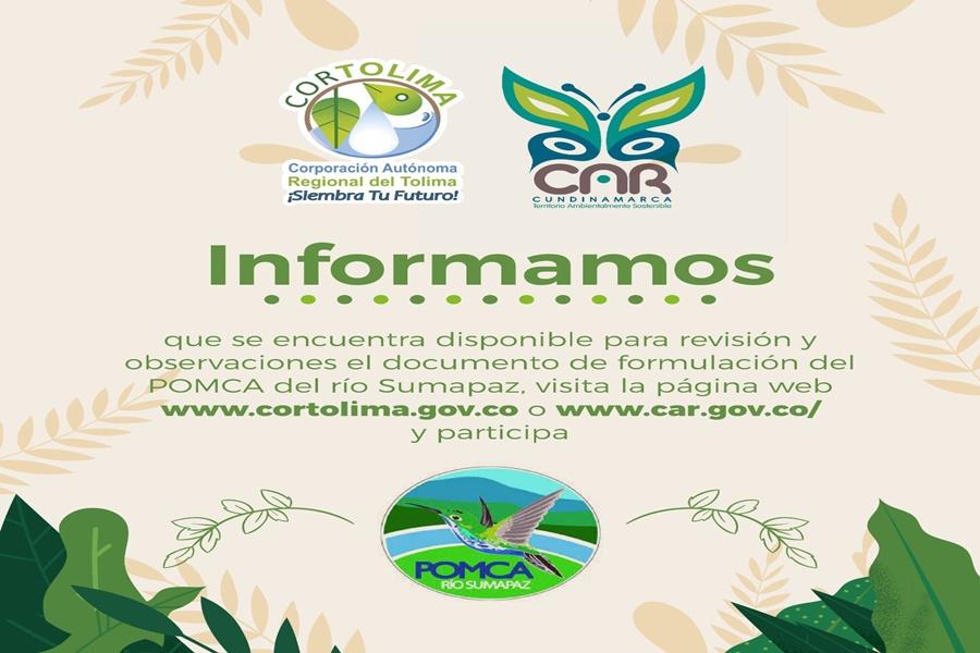 Los actores interesados en la formulación de la primera propuesta del documento técnico POMCA Sumapaz podrán hacer sus comentarios hasta el 23 de mayo de 2023 a través de la página web de Cortolima www.cortolima.gov.co o la página web de la CAR Cundinamarca www.car.gov.co, descargar los documentos que se encuentran allí y enviar sus observaciones a través del siguiente enlace: