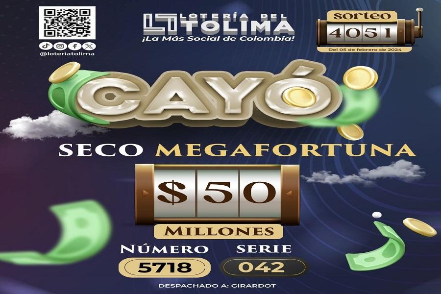 El sorteo de anoche de la Lotería del Tolima dejó dos nuevos ganadores. En la ciudad de Pereira cayó el Seco Lotto Millonario, con el número 2978 de la serie 017, mientras que el Seco MegaFortuna se quedó en Girardot, Cundinamarca, con el número 5718 de la serie 042.